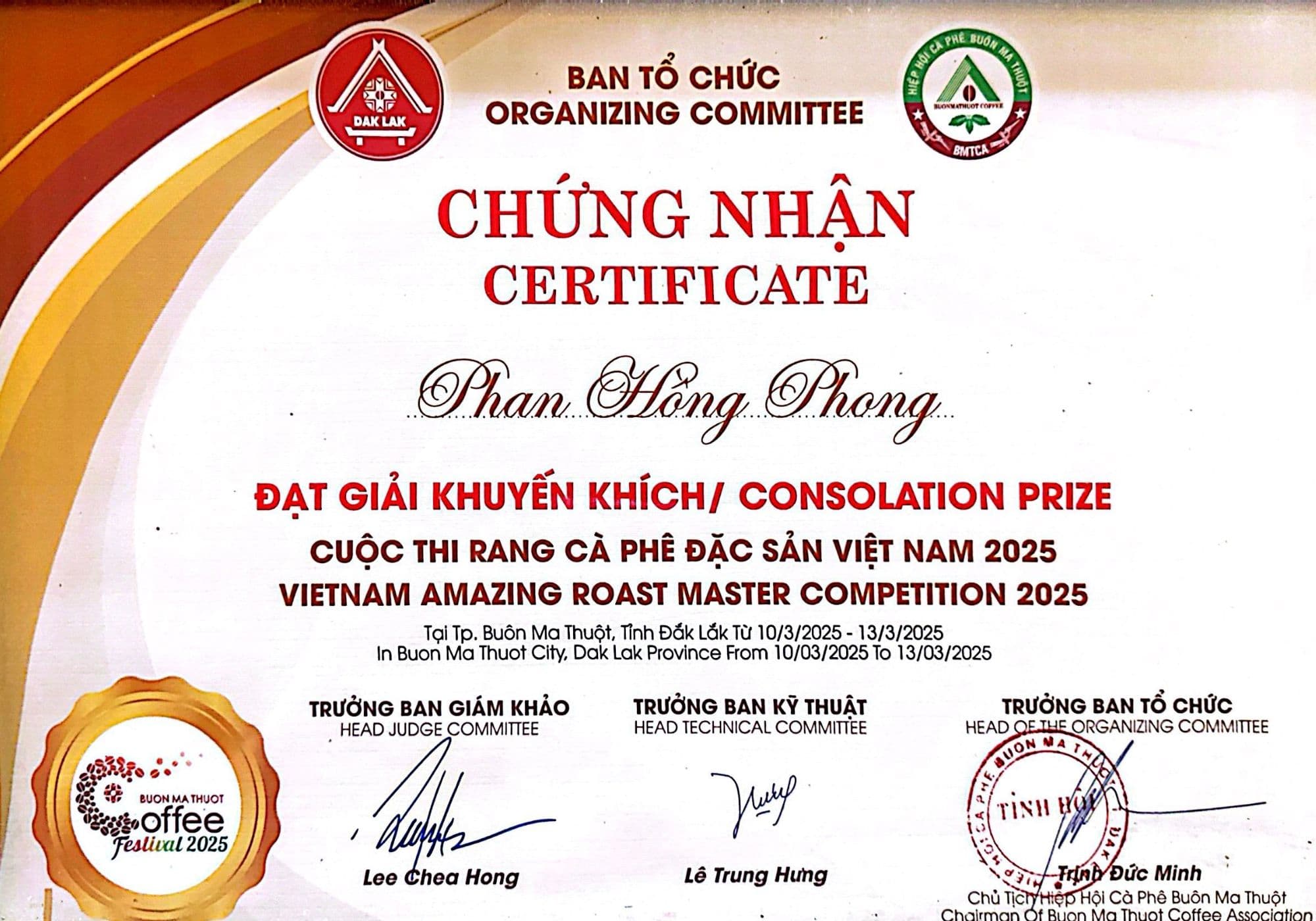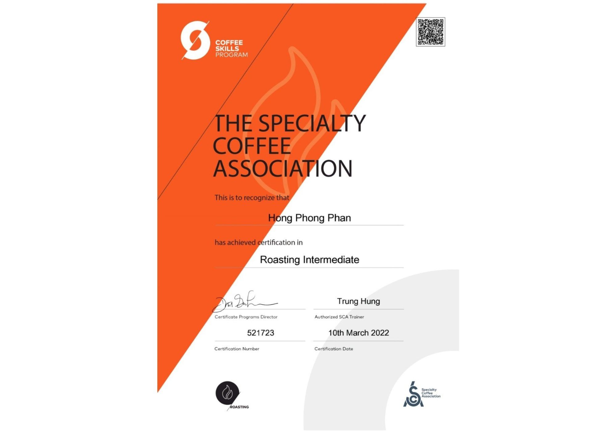 Và từ xưởng rang bé nhỏ nằm vùng biên giới Việt Lào, tụi mình đã học về kỹ thuật rang cà phê đặc sản theo giáo trình đào tạo và được chứng nhận bởi Hiệp hội cà phê đặc sản thế giới SCA, điều này giúp tụi mình xây dựng các mẫu rang chuẩn hơn, mang lại sự đồng nhất và khai thác được thế mạnh cà phê Khe Sanh Quảng Trị.