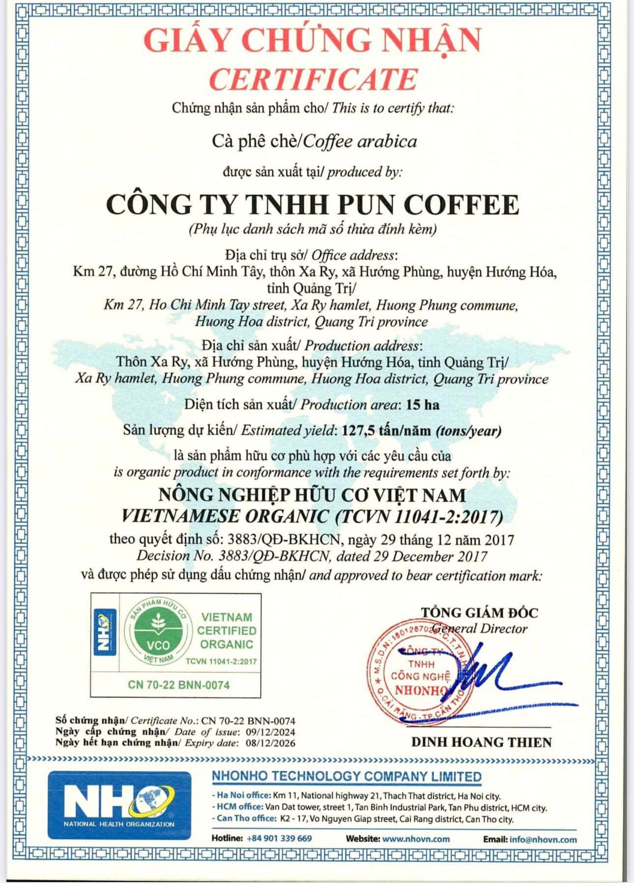 Ngay từ khi đặt những viên gạch đầu tiên xây dựng nền móng cho thương hiệu Pun Coffee, nhà Pun đã triển khai vùng nguyên liệu cà phê canh tác theo hướng bền vững, trồng cây che bóng, quản lý cỏ dại, sử dụng nguyên liệu phân bón tự nhiên canh tác chăm sóc cà phê và sau thời gian miệt mài theo đuổi tụi mình đã có những chứng nhận hữu cơ đầu tiên tháng 12/2024