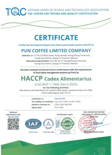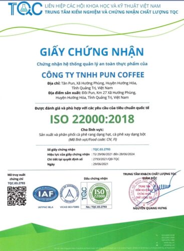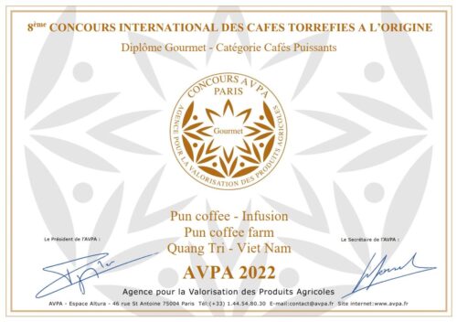 Để gia công được thương hiệu, nhà xưởng Pun Coffee đáp ứng được tiêu chuẩn ISO 22000-2018, chứng nhận HACCP, Kỹ thuật rang được đào tạo tiêu chuẩn rang cà phê quốc tế được chứng nhận bởi Hiệp hội cà phê quốc tế SCA, kỹ thuật rang của Pun Coffee được vinh danh giải bạc, giải đồng giải rang cà phê quốc tế Pháp AVPA Paris 2022.